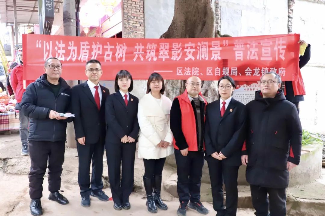 1月17日,安居法院联合区自规局、会龙镇政府前往会龙镇保山上街,以进一步加强辖区古树名木司法保护,引导群众共同守护绿色“活化石”。 共建翠影安澜景普法宣传活动。