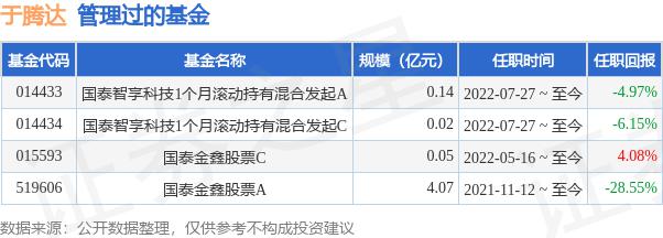 于腾达先生:中国,研究生。曾在兴业证券、泰康资产工作。2017 年 9 每月加入国泰基金,曾任研究员、基金经理助理。2021 年 11 从月开始担任国泰金鑫股票型证券投资基金基金主管。