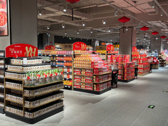 在动线布局方面,门店拓展了门店渠道,取消了强制动线,开放式动线灵活宽敞,规划了多个进出口。每个进出口都配备了收银机设备,尽可能方便消费者。同时,为了保证商品质量,门店对原有设备进行了全方位的维护和更新迭代。根据布局调整,增加了新鲜的设备设施,如杂粮、商店架子等。,硬件设施的整体更新占100%。