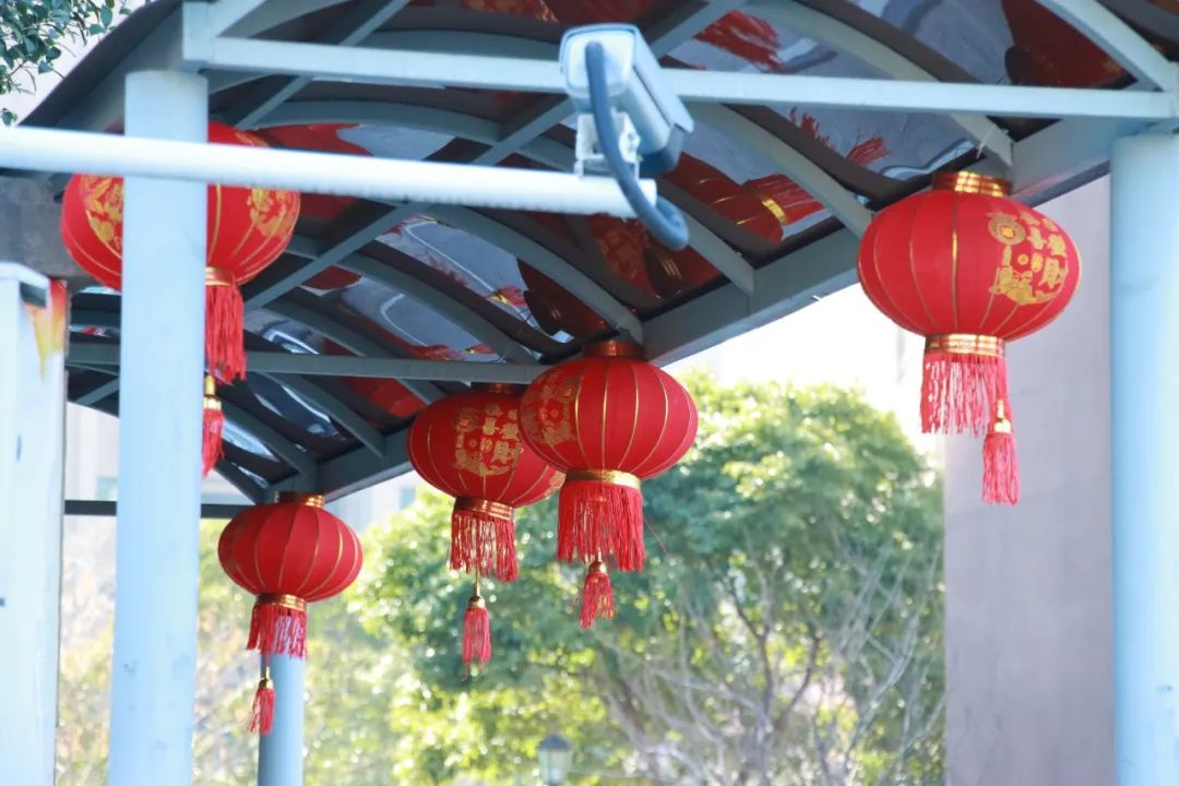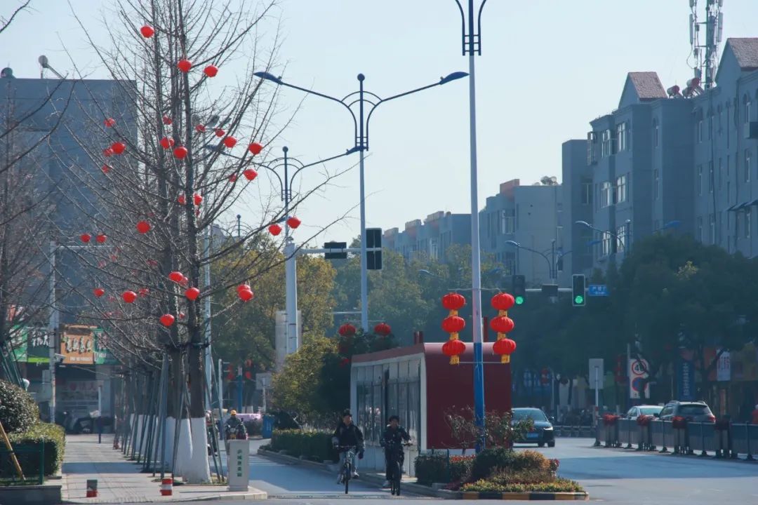 红色是新年的背景。走在庐江的大街小巷,灯笼随处可见。树上、路灯上、大楼门口、公园里,一个接一个,一串串,勾勒出美丽的春节画轴。