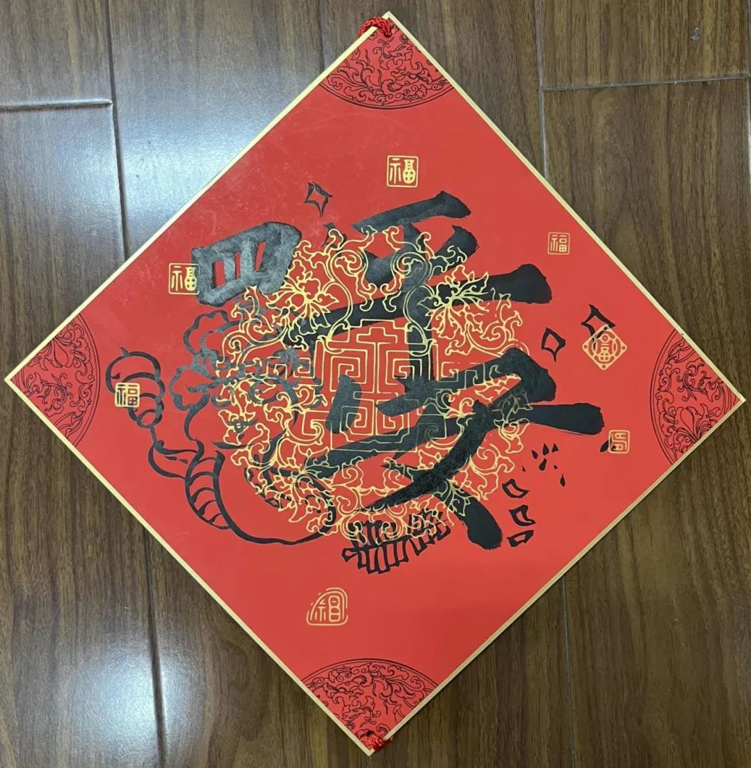 方泰中学老师姚南南创作的《四巳平安》融合了传统书法和吉祥寓意。以蛇宝宝为图案,将代表蛇年的地支“三”放在“四”字下,增添层次感和立体感,传递平安祝福。