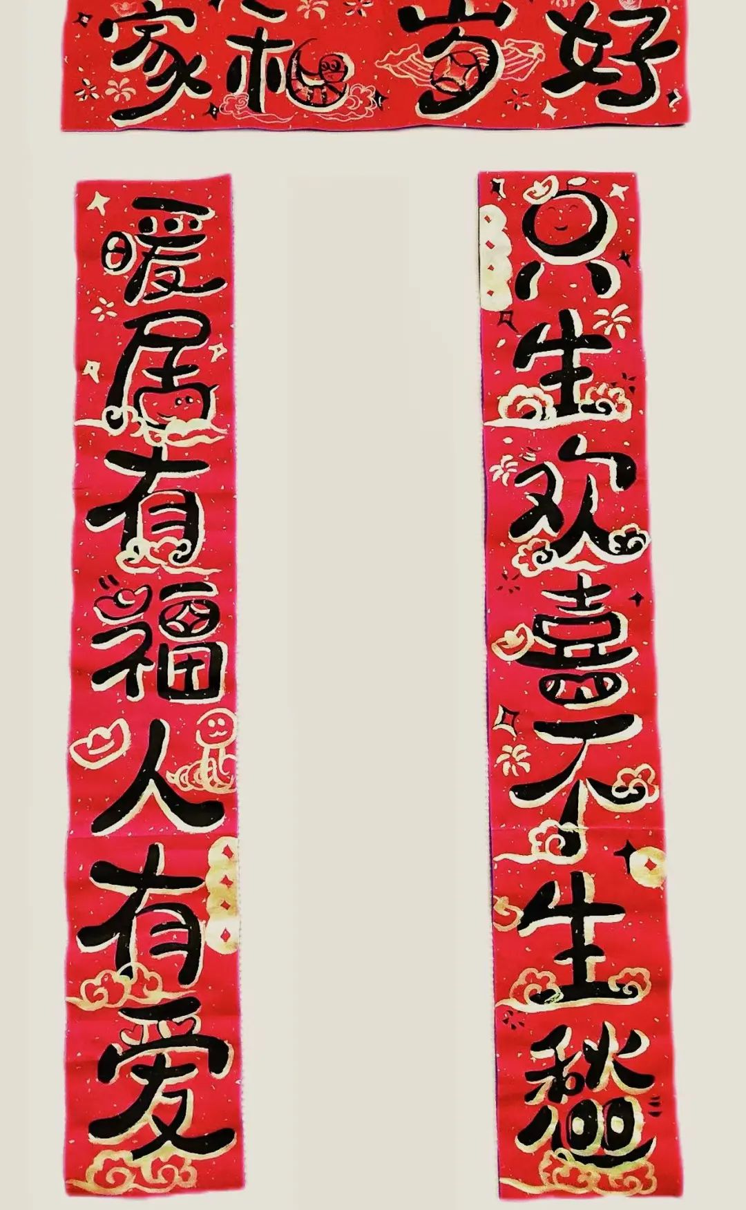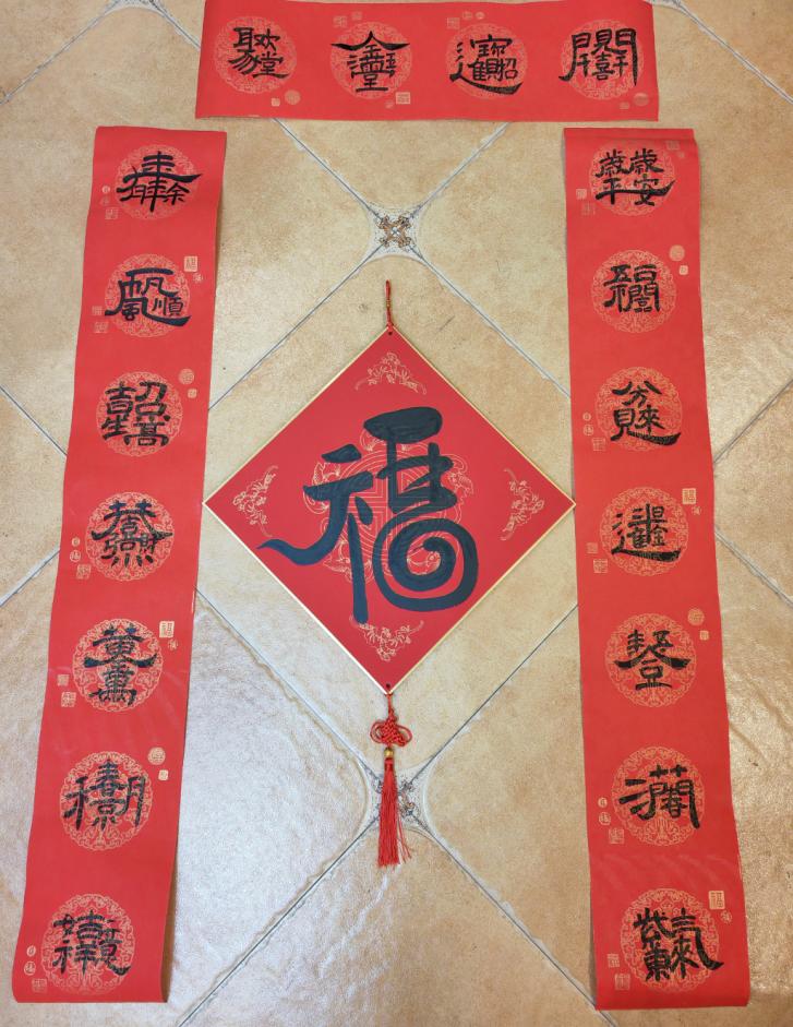 方泰小学学生刘悦彤创作的春联作品,以传统楷书字体为基础,将四字成语笔画拆解重构成一个字。上联“年年有余,一帆风顺,吉星高照,恭喜发财,金万两,春光明媚,万事如意”,下联“岁岁平安,五福临门,八方来财,日进金,五谷丰登,春满天下,紫气东来”,横批“开门见喜,招财纳福,金玉满堂,欢聚一堂”。