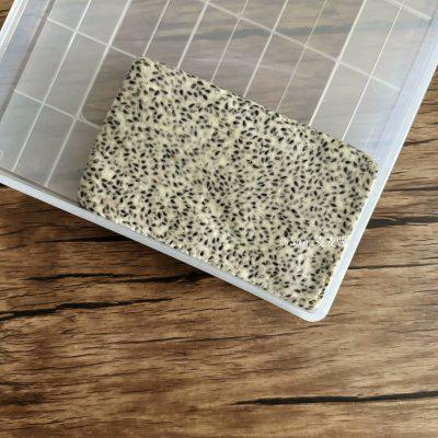 6、将黑芝麻团倒入牛轧糖模具中,整理成型,冷却后切成块。
