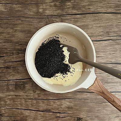 5、倒进 55g 熟黑芝麻翻拌均匀
