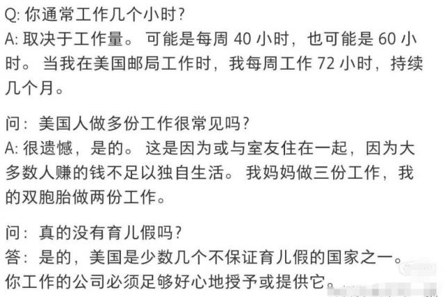 我们一直认为他们的工业是空心的,工业是衰落的,因为他们不努力,因为他们懒惰、愚蠢、放纵、自私和放荡。 ... 现在和他们交流,我们知道美国工人和我们一样努力,甚至比我们更努力。毕竟这里很少有人能“一天工作”。 16 一小时,打三份工作,一天吃一顿饭,午餐都要借钱,学生贷款一辈子还不完,生病全靠止痛药背着”。