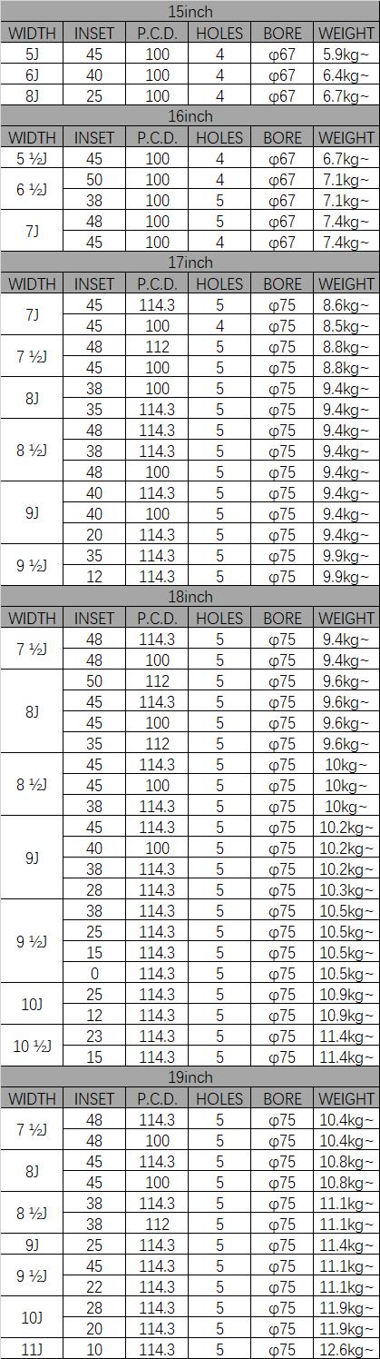 PF05尺寸方面 还是很全面的覆盖,从最小的开始。 15 寸 最大的5J 19 寸 11J 且 ET 只有 10 激进数据,全部覆盖,孔位从 4*100,到 5*100/112/114.3 还有,基本上覆盖了普通的小型车(GK5、雨燕),JDM 运动型号和一些德系车型,MINI、大众,奥迪,奔驰都可以,最有用的就是各种英菲尼迪,丰田等等。