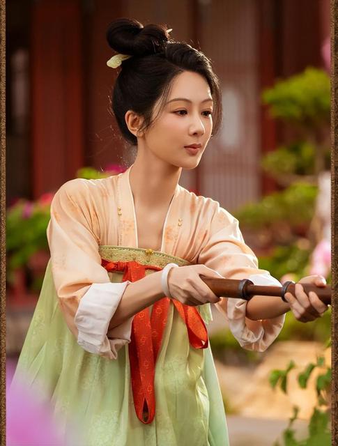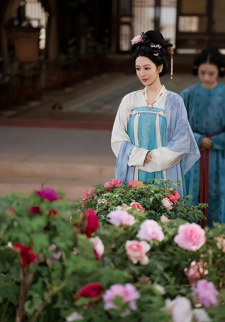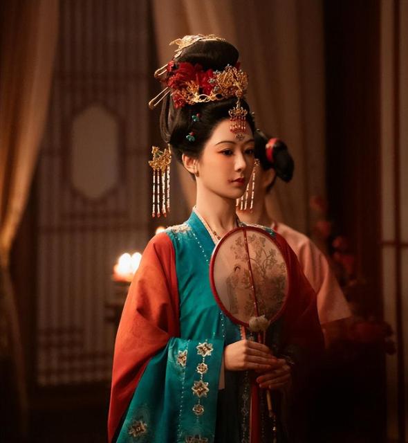 头部配花,仕女妆,配齐胸长裙,花样点缀头发和脸部,杨紫的古装,让杨玉环的形象更加生动。
