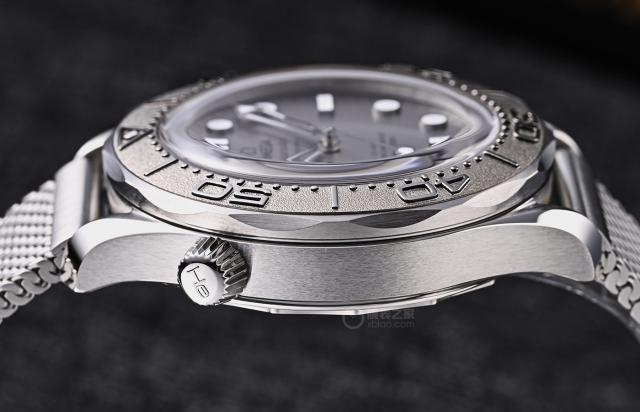 从实用的角度来看,表面的拉丝装饰也会起到遮盖毛划的作用。壳体这边也有海马。 300 米表标志性排氦阀。