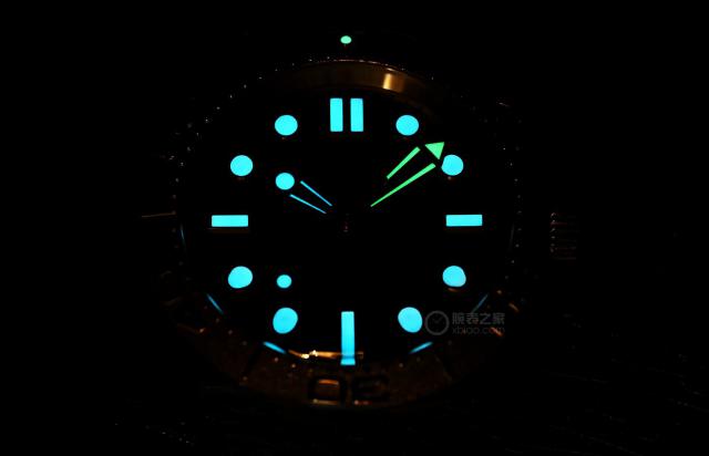 指针时标,以及表圈 12 点的刻度标记,均涂有白色 Super-LumiNova 夜光涂层。上图为手表夜光实拍,为了更好的在水下阅读潜水时间,分针和表圈夜明珠做了绿色夜光,实际上是两色夜光效果。