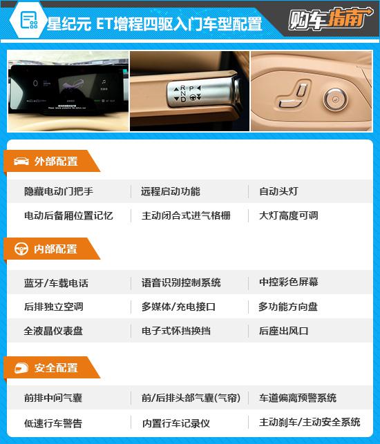 星途星纪元 ET 增程四驱的入门级车型是增程四驱。 Max 四轮驱动,厂家指导价 23.98 万元。尽管是入门级车型,但整体表现并不差,如前排中间气囊、前排中间气囊、 / 后排头部气囊 ( 气帘 ) 、安全、方便、舒适的配置,如远程启动功能、二排座椅电动调节、自动空调、前排手机无线充电等。之所以不推荐入门级车型,主要是因为性价比更高,性能更好。