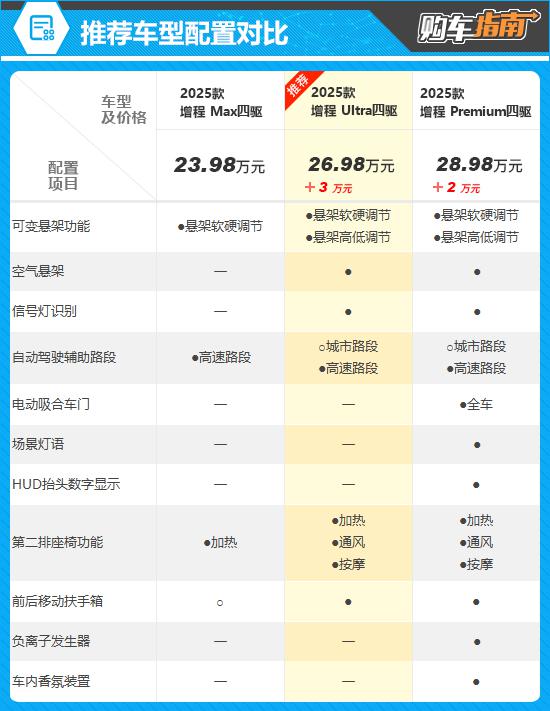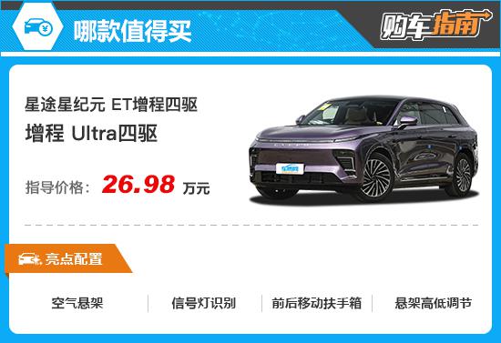 从综合配置和价格来看,星途星时代 ET 个人推荐增程四驱的消费建议。 Ultra 四轮驱动,厂家指导价为 26.98 万元。与低级别车型相比,推荐车型在驾驶功能和舒适性配置上有了明显的提升,如增加空气悬架、信号灯识别、第二排座椅通风等。 / 按摩功能等。,用车体验更好,虽然价格上涨。 3 一万元,但绝对是物有所值。