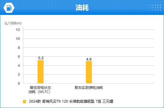 汽车质量网综合工业和信息化部及各汽车垂直网站的统计数据, 2024 款奇瑞风云 T9 官方公布的 WLTC 最低荷电状态下的油耗为 5.2L/100km;易车实测馈电油耗为 4.9L/100km(以上数据仅供参考)。