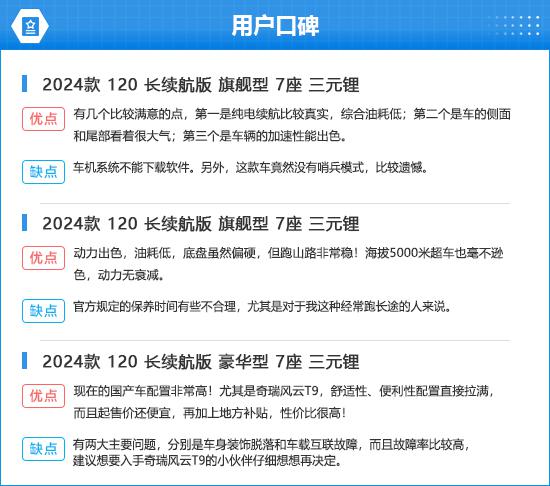 “奇瑞风云”在车质网 T9 "在车系频道中,共有 10 人们参与评分活动,其中 5 星、4 星、1 星评价各有 3 人,还有 1 人给出 2 明星评价。评论中,车主梳理出奇瑞风云。 T9 利用过程中的优缺点,可以为其他客户提供更真实、更全面的参考意见。