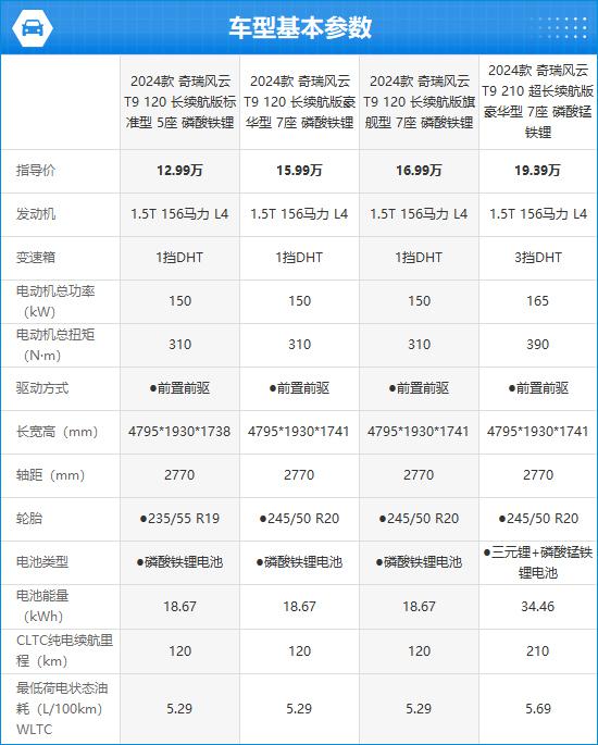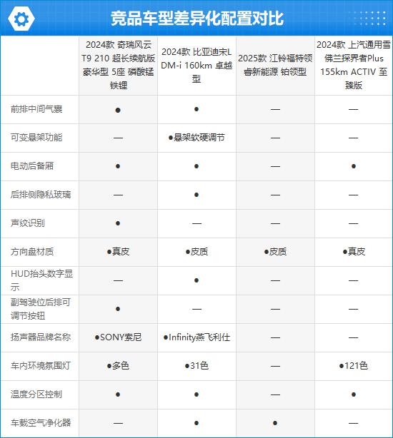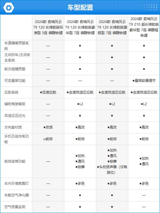 通过配置对比发现,2024 款奇瑞风云 T9 为消费者提供多种动力、电池类型和电池寿命,非常多样化。值得一提的是,除了入门级车型,其他车型还配备了多种方便舒适的配置,如全速自动巡航、座椅加热等。 / 通风、混色车内环境氛围灯等,可谓诚意十足。