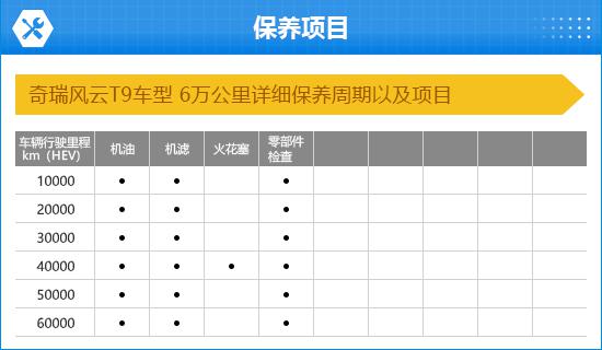因为 2024 款奇瑞风云 T9 选择插电式混合动力系统,维护项目和维护时间繁琐,所以我们只列出了一些维护项目(详情请参考官网或店铺咨询)。