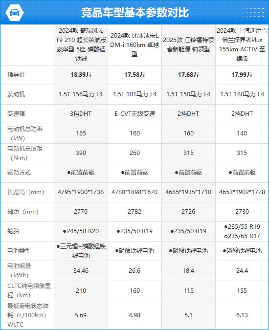 相对于竞品车型,2024 款奇瑞风云 T9 在 CLTC 在纯电续航里程方面更具优势,对市区只想用“电”代替步行的消费者来说更为合适。与此同时,配备表现也不错,独享声纹识别和副驾驶座后排可调按钮等功能。不过,2024 款比亚迪宋 L DM-i 专属悬架软硬调节,后侧隐私玻璃及后侧隐私玻璃 HUD 2024年抬头数字显示等配置 款奇瑞风云 T9 均未提供。总体表现方面,2024 款奇瑞风云 T9 配置方面处于同级中上游水平。