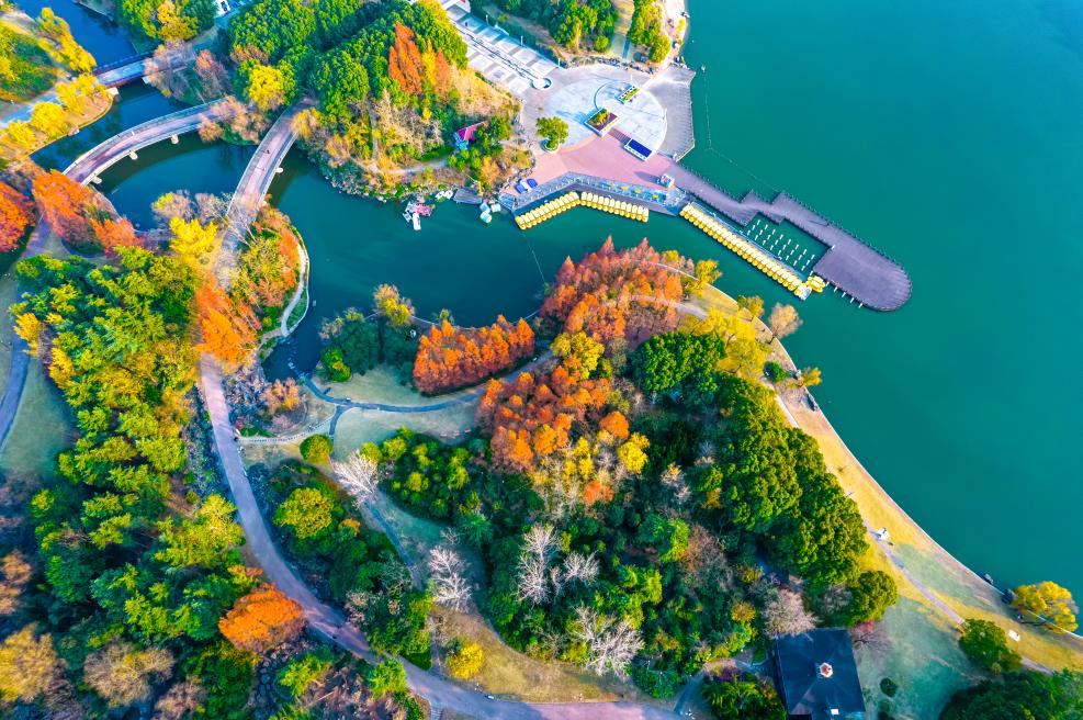 “汽车博览公园里有红杉、银杏、枫叶等各种色叶树。秋天,浅黄色、绿色和鲜艳的红色混合在一起。此外,湖水清澈,小桥蜿蜒,既有大色块,又有优美的线条。所以我把这些元素都融入其中,希望更多的市民能在这里看到美。” 介绍黄永庆。