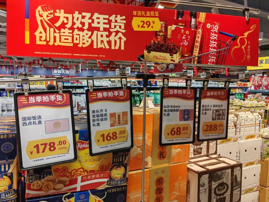 日前,记者在凯德晶萃广场的ALDI奥乐齐看到,年货产品已经布局在入口处最显眼的位置。今年紧跟“为好年货创造足够低的价格”的观点,为上海客户精心准备了约300款低价“新年货”,200多款价格都在100元以下。