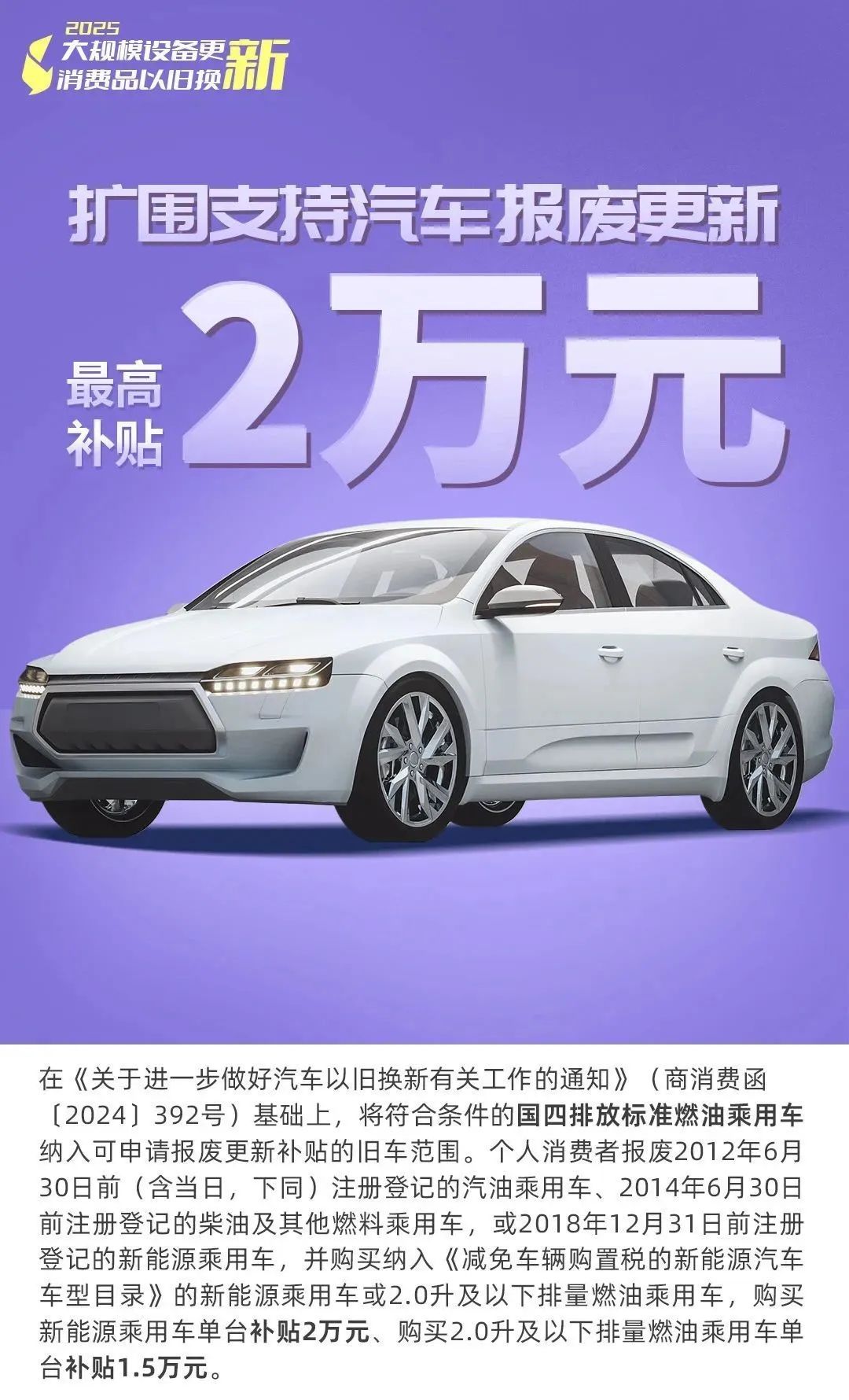 近日,国家发改委、财政部正式发布《关于2025年实施大规模设备更新和消费品以旧换新政策的通知》(发改环资)〔2025〕十三号),明确2025年汽车报废更新补贴将继续实施,快来看看吧!
