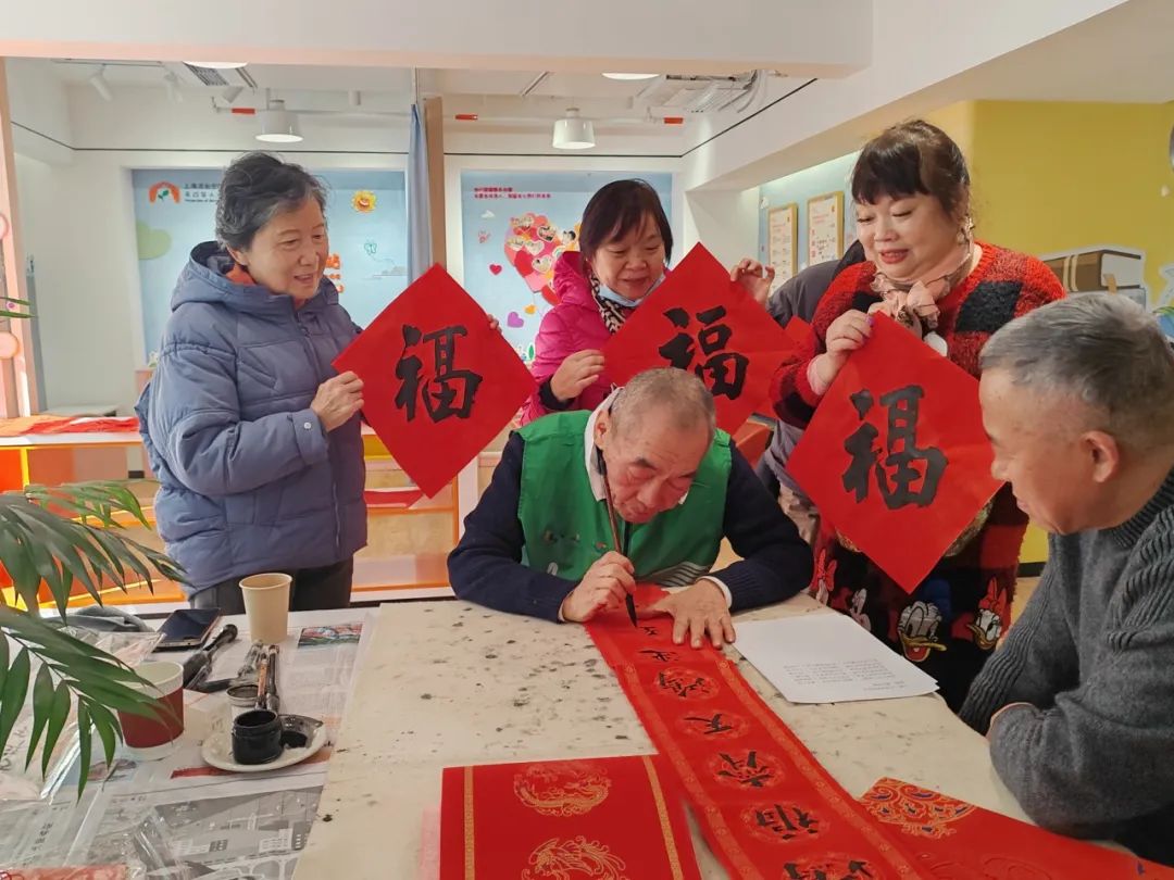在铺纸、蘸墨、落笔、充满墨香的迎新现场,书法家们“泼墨”,写出了几个喜气洋洋的“福”字和春联,吸引了很多居民前来观看。“我们在一起就像一个大家庭,有一种氛围,就像春节一样,我们很开心。”居民吴阿姨用“福”字笑得灿烂。