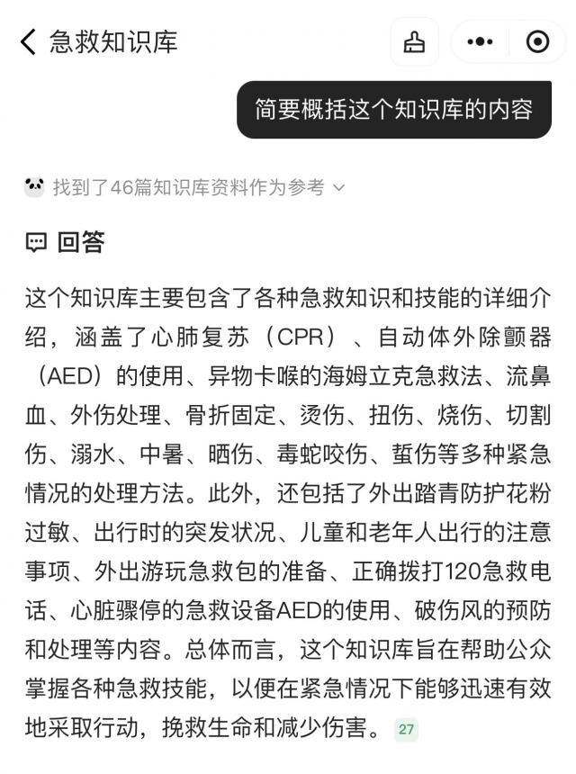 在国家救援日之际,腾讯医学典依托权威医学科普内容,编制了一个急救知识库,为多个领域、多个方向提供权威的急救知识。同时,我们将这些知识传递给 ima “共享知识库”,能 7x24 基于全网或知识库的小时提供智能 AI 问答,不需要自己检索,打开 ima 知识库小程序提问就能得到答案。