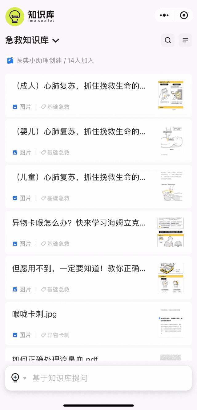 生活中大多数常见的突发情况,从鱼刺卡喉到毒蛇咬伤,你都可以通过“ ima “知识库”小程序进入“急救知识库”,通过问答获得快速、权威的急救知识。