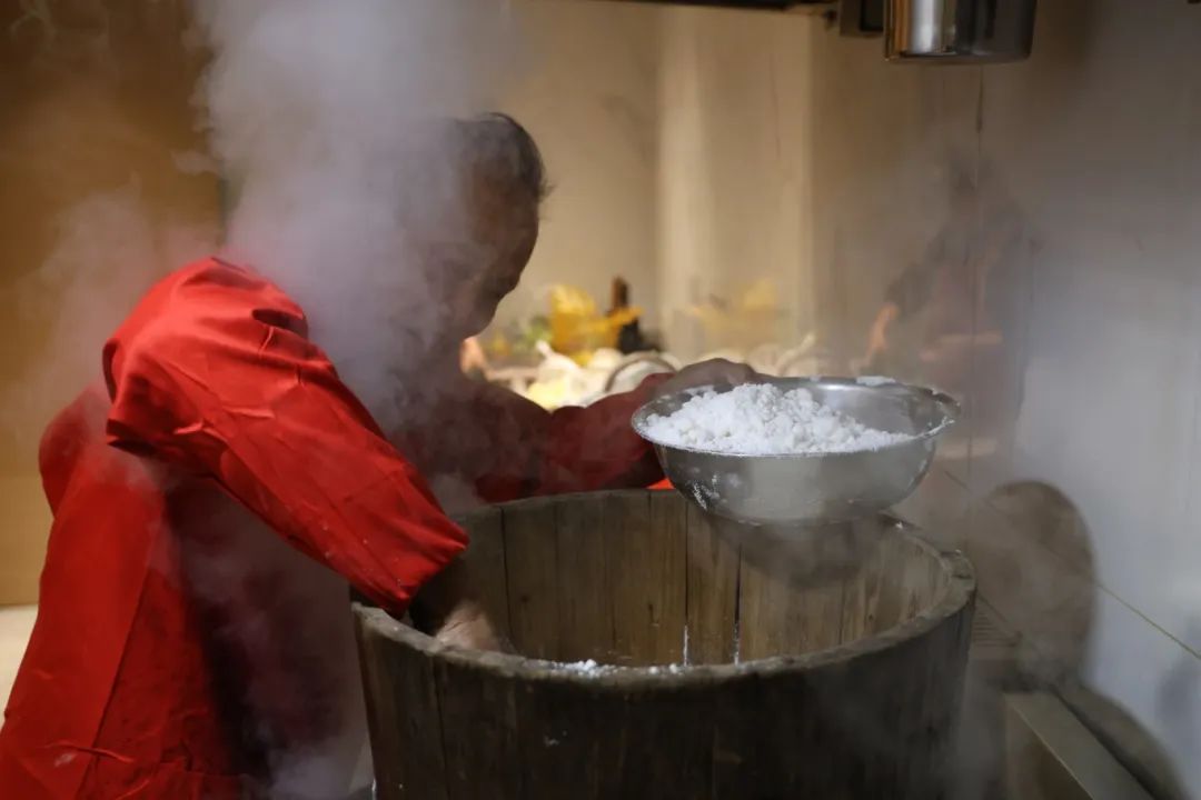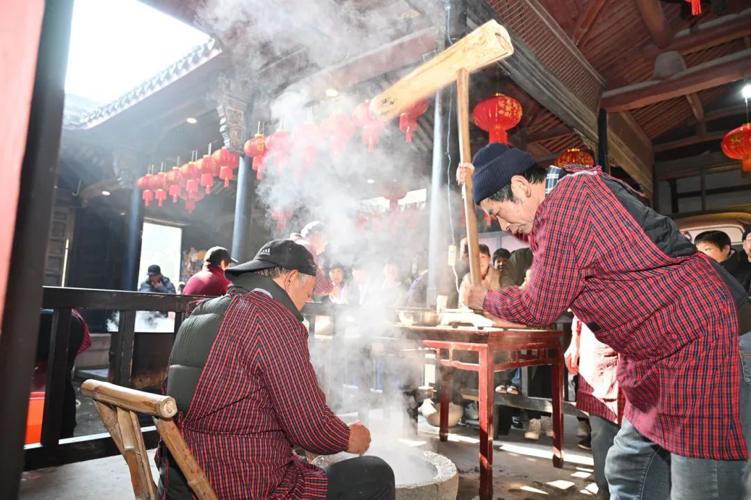 蒸好的大米,在一次又一次的重复间里,逐渐变得坚韧和蜡质,直到不粘在石臼上,然后分次截取,或者用手搓成条状,或者用力按压,做成圆形或长形的蛋糕。别人也会在做好的年糕上,敲上一个红色的福印,增添喜庆,增加福分。带回家的年糕,虽然表面上看起来很优雅,但实际上可以蒸、炸、炸、煮、煨。它是一个“六边形战士”,糖煎年糕,梭子蟹炒年糕,年糕粥...听了之后,哪一个不叫舌底生津。
