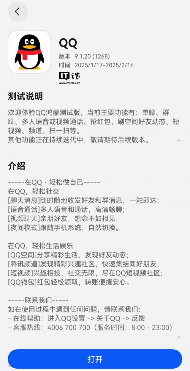 IT 世家 1 月 19 日消息,QQ 纯血鸿蒙版 App 本周在华为的应用市场(App Gallery)打开 9.1.20(1268)版本尝鲜升级,测试时间为 2025/1/17 - 2025/2/16。