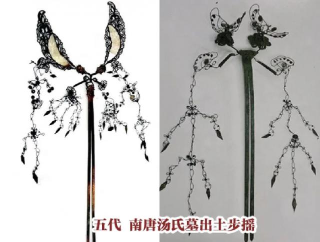 但是在这么高的发髻上,为了防止视觉过重,不要太复杂。发夹花瓣 步摇簪,还有一些小的配簪就可以了。这样的步摇簪,五代也出土过类似的风格。