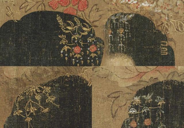 牡丹、芍药等依然是贵女们忠爱的花饰,即使不在花季,也可以做成丝绸等配饰。看得出簪花风气之盛。
