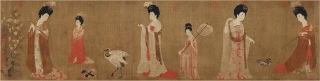 再来说说造型。为什么这幅画的本质在于造型?因为这幅画里有五个女士和一个婢女,所以女士的衣服和造型趋于一致,记忆点太深,涵盖了短阔眉、大袖衬衫、发夹、峨髻等元素。最让人印象深刻的是,这种让人看着头骨可能有压力的发型,以及剃过的短阔眉(也叫飞蛾眉、桂叶眉等)。).