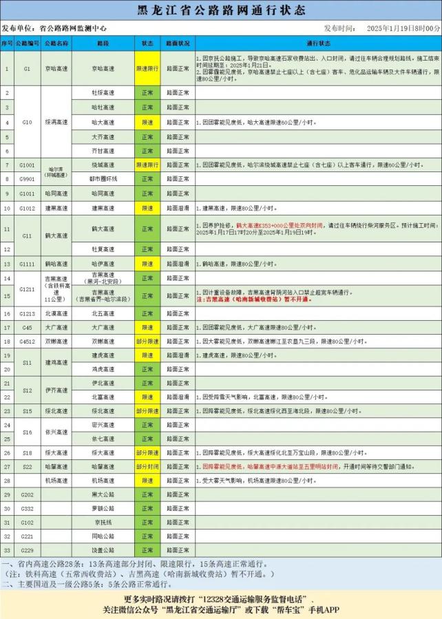 一月十九日八时汇总实时路况:部分封闭限速限行高速(13条高速):哈肇高速(中源大道站至五里明站),关闭。2.建黑高速、建虎高速、鹤哈高速、北富高速、大广高速、双嫩高速(嫩江站至农垦九三站)、绥北高速(绥化西站至海北站)、绥大高速(绥化北站至万宝山站)、机场速度高,限速80公里/小时。哈大高速,限速60公里/小时。哈尔滨绕城高速公路,禁止7座(含7座)以上公交车通行,限速60公里/小时。京哈高速公路,禁止7座以上(含7座)公交车、危险化学品运输车辆和大型车辆通行,限速80公里/小时。省内其他高速公路条件正常。