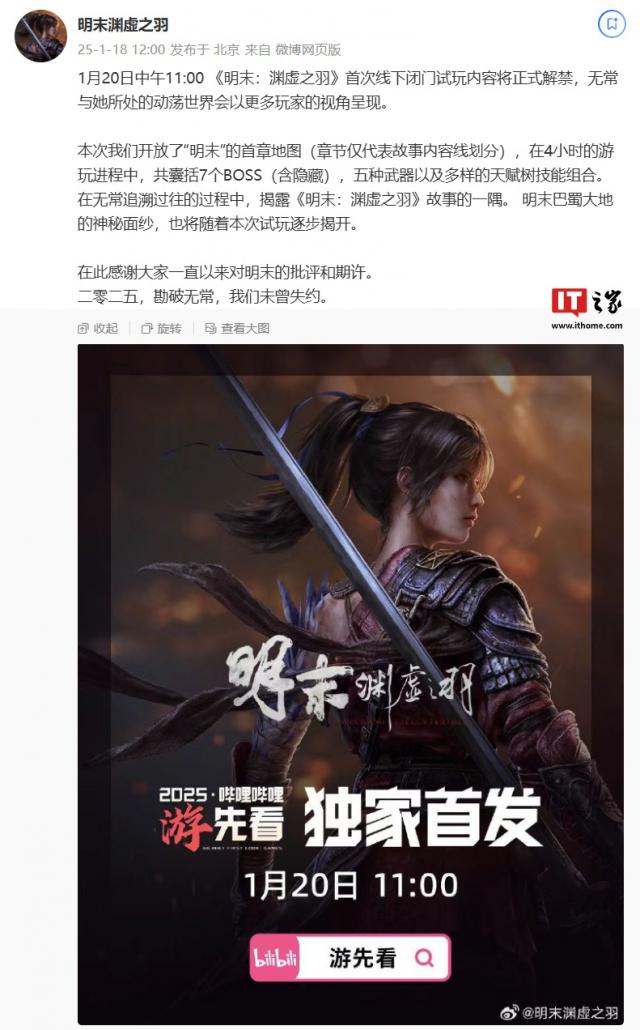 IT 世家 1 月 19 据国产魂游戏《明末:渊虚之羽》官方公告,本书将在国内类魂游戏中公布。明日(1 月 20 日)中午 11:00 首次线下闭门试玩内容正式解禁。
