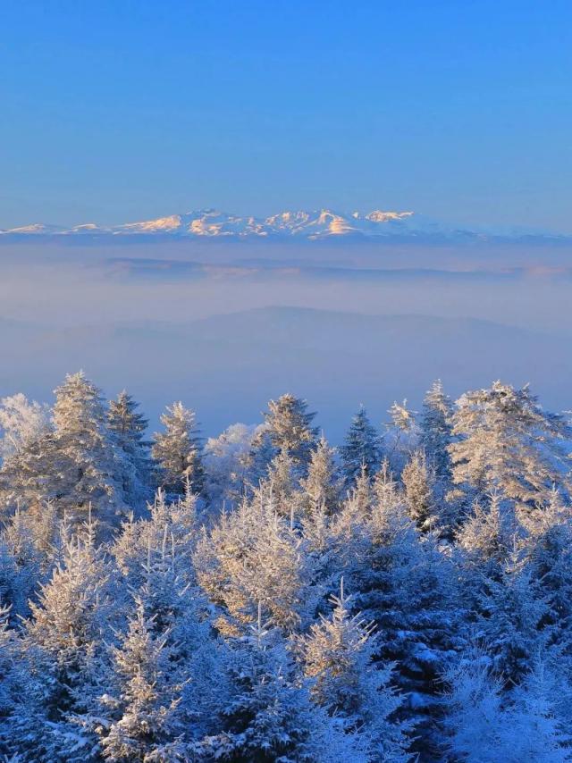 冬天的六鼎山,辽阔的雪地一望无际,像一片神圣的海洋,淡泊而宁静。远处的群山被冰雪覆盖,连绵起伏的群山在阳光下闪耀着银光,就像一条蜿蜒的龙。