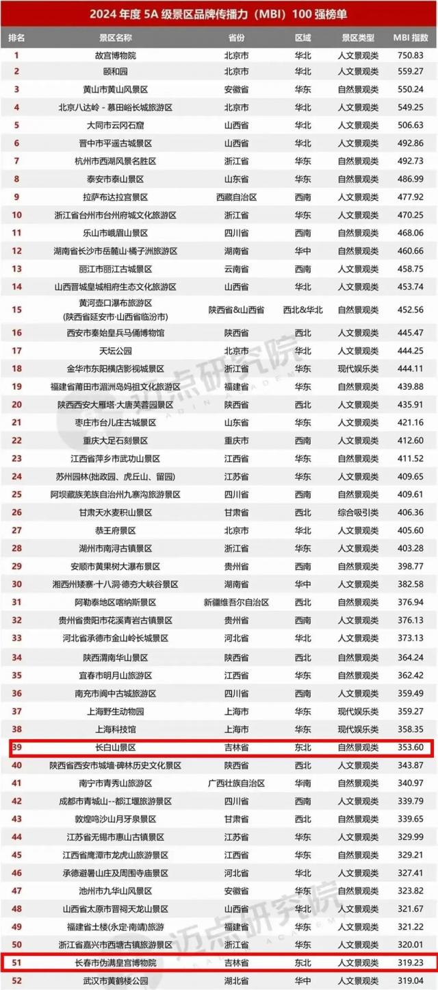 2024 年 5A 一级景区品牌传播力 100 强榜单显示