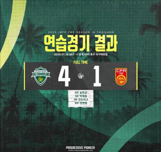 第 60 在几分钟内,国青队本着所有球员替补出场的原则,替换了门将刘邈玮和队长史松宸。然而,全北队继续控制着场上的局势。第 77 几分钟后,全北队在中场左侧成功断球。安德里戈个人运球后,突破成功从斜视角抽射,将比分改写为 3-0!在此期间,国青队几乎没有对对方的球门构成威胁。相反,在三球领先之后,全北队还有两次进一步扩大比分的机会。