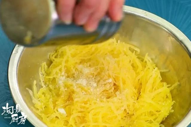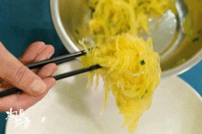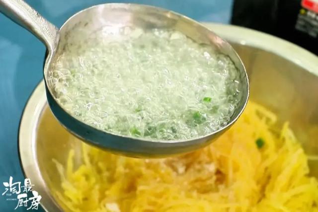 ❷ 锅里油热舀 1 放入火锅勺(30ml) 1 调汤(15g)葱花爆香,然后倒在金瓜丝上,趁热拌匀即可。