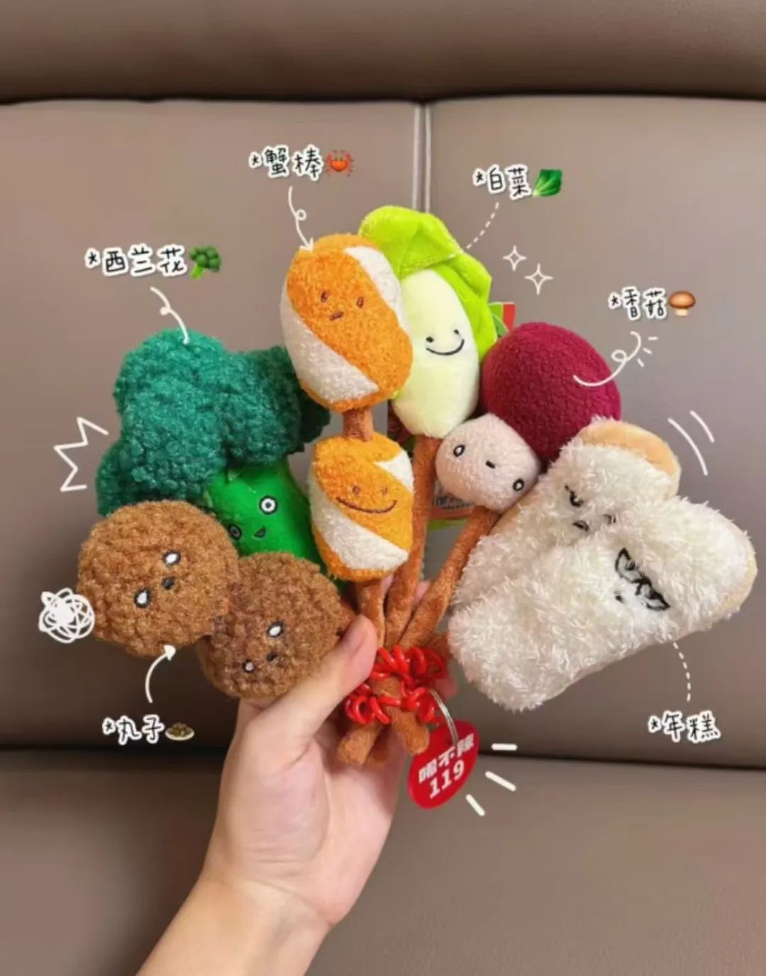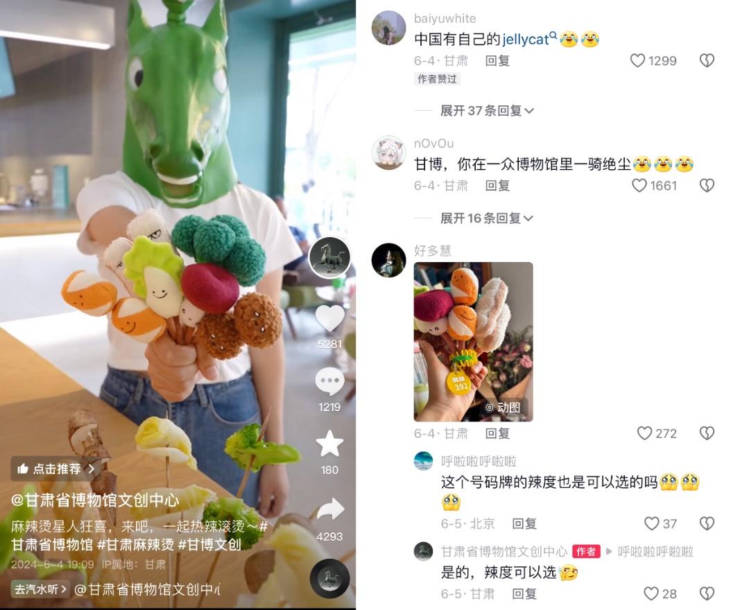 甘肃省博物馆开创的“甘肃麻辣烫玩偶花束”是各中代表。不仅将爆火的麻辣烫IP价值延续,还精准捕捉当下情绪消费的新需求,掀起了一场本土jellycat式打包潮,打造出新的体验式文旅消费场景,山西、福建、河北等各地文创也火速跟上。