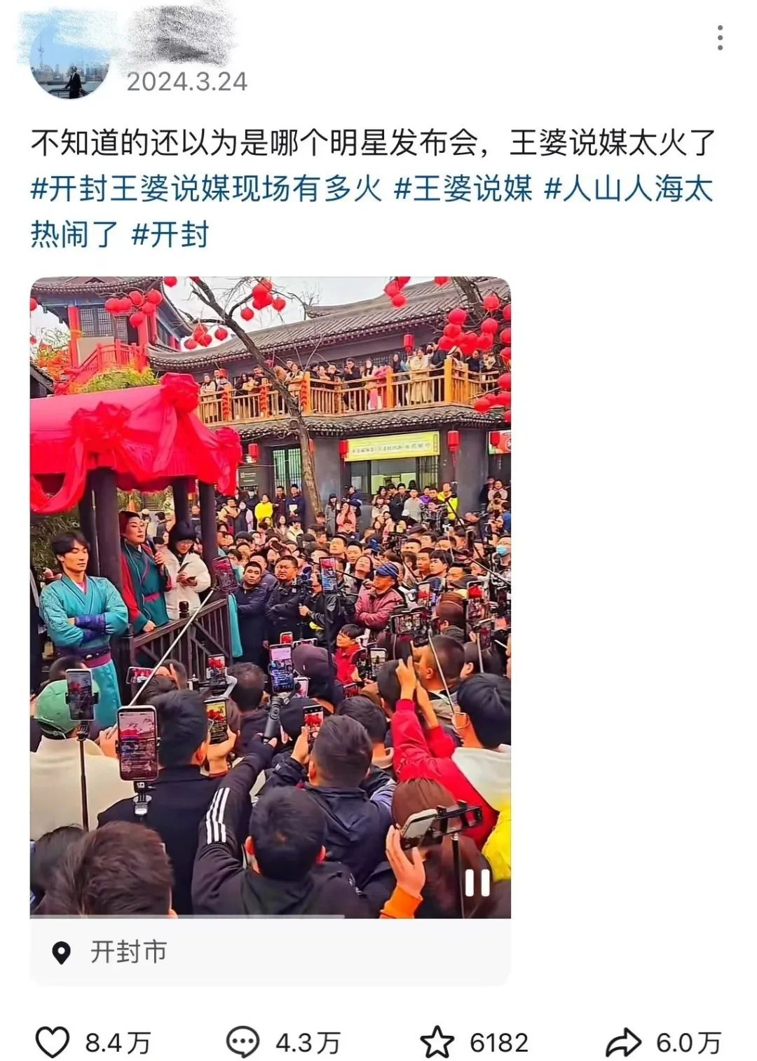 河南开封王婆说媒也在短视频平台火出圈,王婆的视频评论区甚至变成了年轻人的“相亲角”。“王婆”凭一己之力,不仅带火了万岁山景区,还带火了开封这座城。