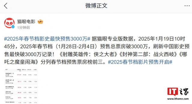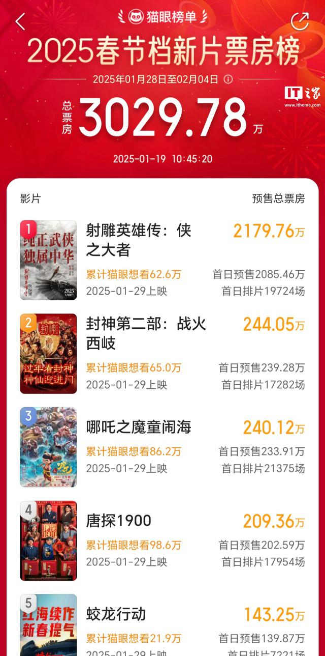 IT 世家 1 月 19 据猫眼专业版数据显示,2025年 年 1 月 19 日 10 时 45 分,2025 年春节档(1 月 28 日 -2 月 4 日期)预购总票房破裂 3000 万,刷新中国电影史预购最快破坏 3000 万记录。