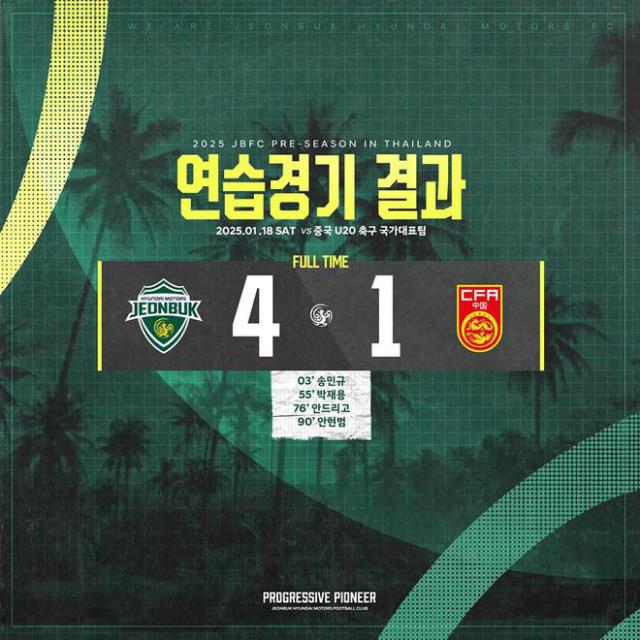 北京时间 1 月 18 日下午 5 点,正在泰国训练的中国。 U20 根据现场记者马德兴的消息,与韩国全北现代进行了一场友谊赛,这场比赛的最终比分分为 U20 国青 1-4 全北现代。