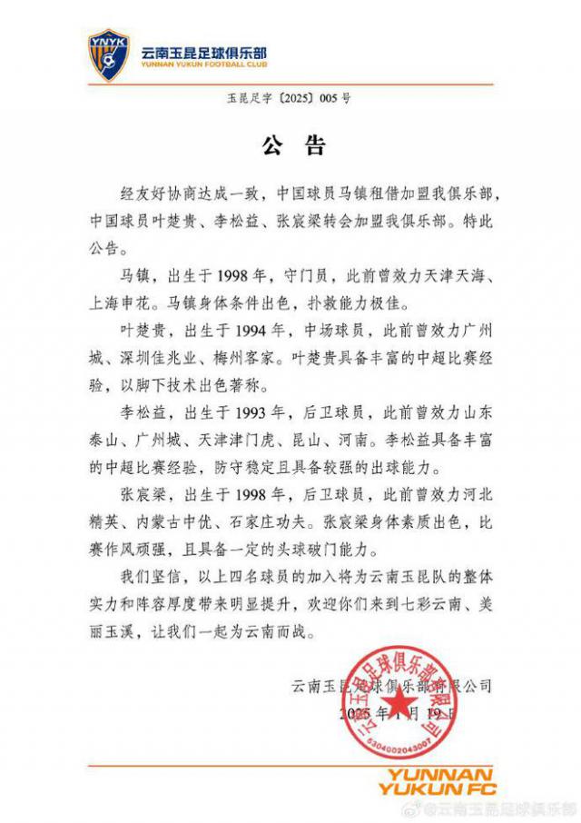 我们坚信,以上四名球员的加入将明显提升云南玉昆队的整体实力和薄厚阵容。欢迎来到彩云南和美丽玉溪。让我们一起为云南而战。