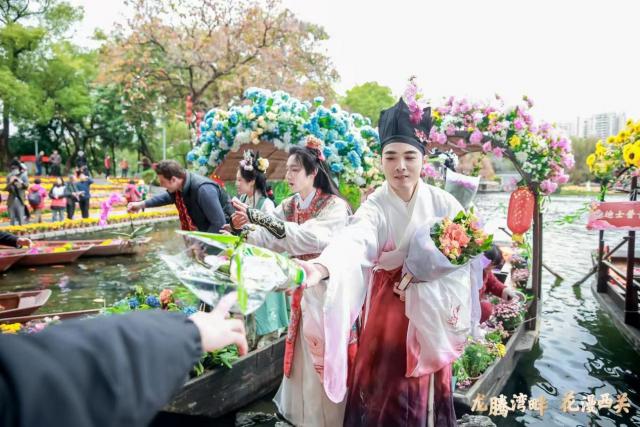这次活动的一大亮点就是再现“岭南传统”,让人怀念。水陆花市交易盛景。精心打造的特色花船就像水上明珠,承载着岭南花卉、广府文化、蛇年主题、荔湾“水秀花香” IP 多重内涵。