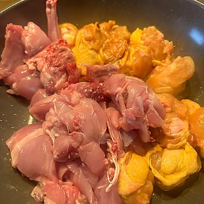 6、加入鸡肉和兔肉,先切好,翻炒。