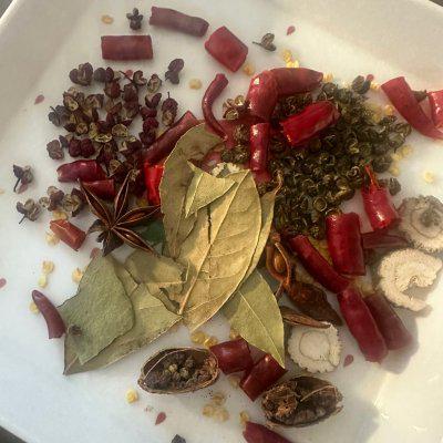 2、准备八角、香叶、白芷、辣椒、辣椒、辣椒、毛砂仁切开