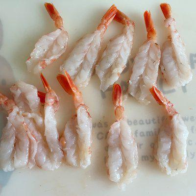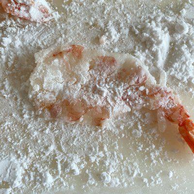 4、裹上一层生粉,用擀面杖敲击大虾。