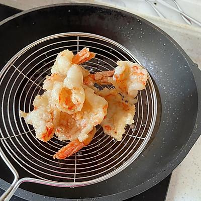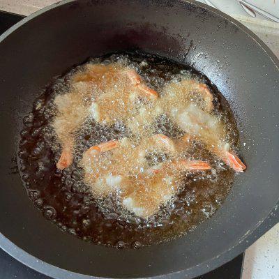 7、炸至定型后捞出,将油温高,再次炸至大虾松脆捞出控油。