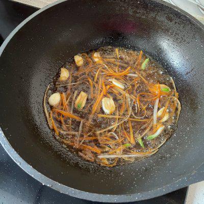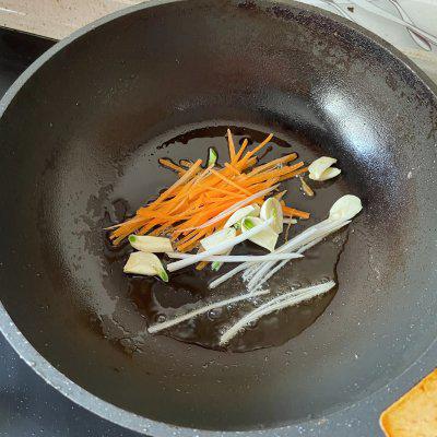 8、锅里留下底油,放入胡萝卜丝大蒜,葱炒香