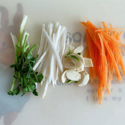 1、洋葱、胡萝卜切丝、蒜片、香莱切片备用