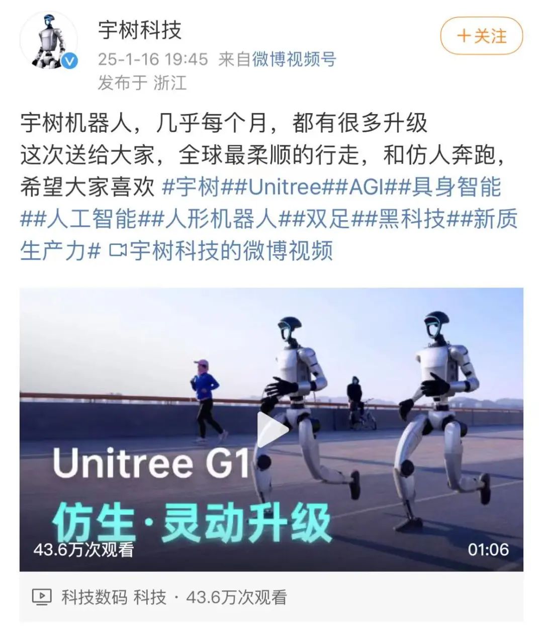 根据宇树科技的官方声明,最新 G1 可以实现 “ 世界上最柔软的行走和仿人飞奔 ” 。